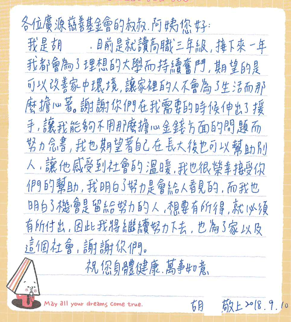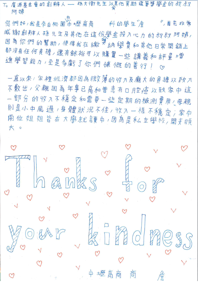 基金會回復的話 非常開心收到同學們的來信,在承重的課業壓力之餘,還不忘感謝曾經幫助過自己的人,甚至懂得爸媽的辛苦,將其這份感激化為力量,持續在課業上努力認真表現,也懂得化壓力為動力,更上一層樓,並保持一顆善良的心。 基金會期望同學們將想要回饋社會的心,可以提前實現,從日常身邊小事著手(例如幫助低年級的學弟妹課業解答及讀書技巧、環保淨垃圾、提供可讓他人學習的自我專長影片予廣源慈善基金會官網、利用空閒時間主動加入廣源慈善志工---等),相信樂於助人及大方分享的好習慣,會為你種下美好的果實。 學生感謝的話 想說的話 (感謝或其他留言)如有錄音或錄影檔想上傳,請直接貼上分享連結網址*主旨*真實姓名*性別*行動電話*Email*學校名稱或公司名稱*職稱是否為配合中之學校是否是否為辦理助獎學金之學校承辦人是否上傳附件(僅限圖片、相片、文件檔)是否為正或曾領取廣源慈善助獎學金之學生是,正領取廣源慈善助獎學金之學生是,曾領取廣源慈善助獎學金之學生皆否送出Please enable JavaScript to submit this form.This field should be left blank